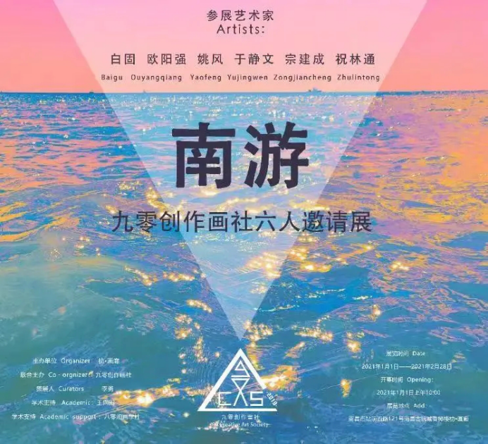 本网讯 艺术设计学院肖英林报道 2021年1月1日上午10时,南游——九零创作画社六人邀请展在南昌朸·画廊拉开帷幕,展览由朸·画廊和九零创作画社联合主办。此次展览邀请到全国九零创作画社的六位重要成员,展出了他们30余幅精品力作,这是继“喜入歧途—游山翁个人油画收藏展”之后朸•画廊举办的又一个重要展览活动。